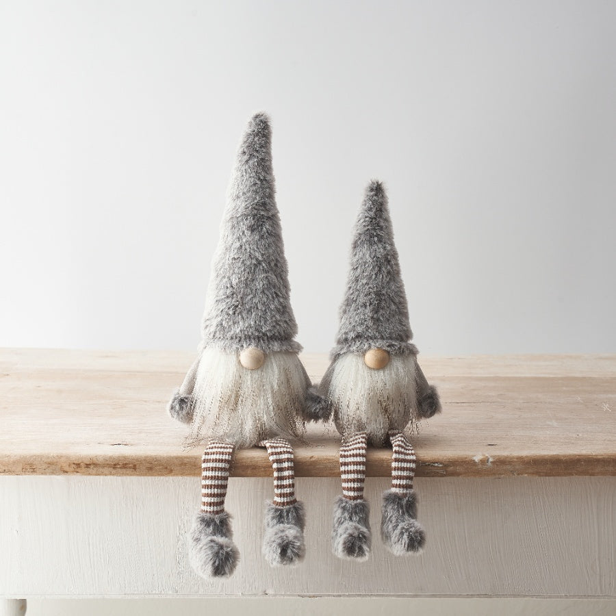 Une charmante décoration gonk avec des détails en fausse fourrure grise, un motif de jambe rayé et une barbe moelleuse.