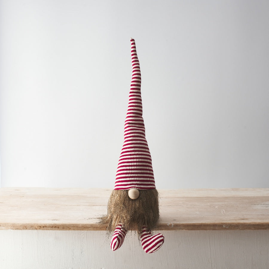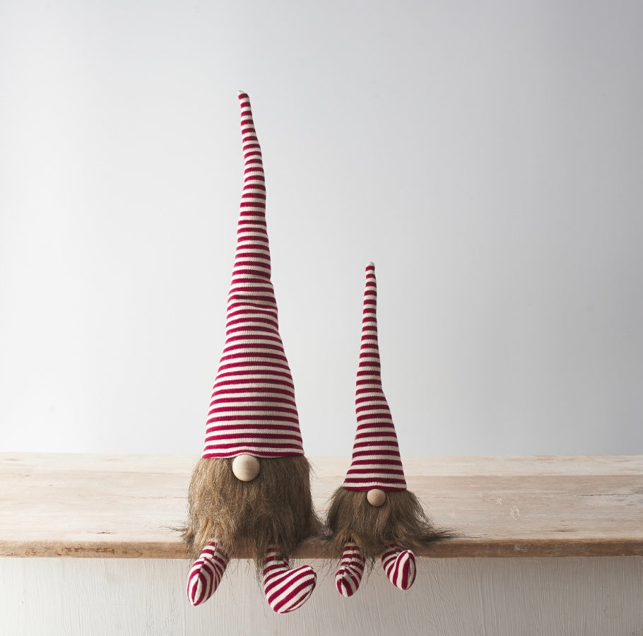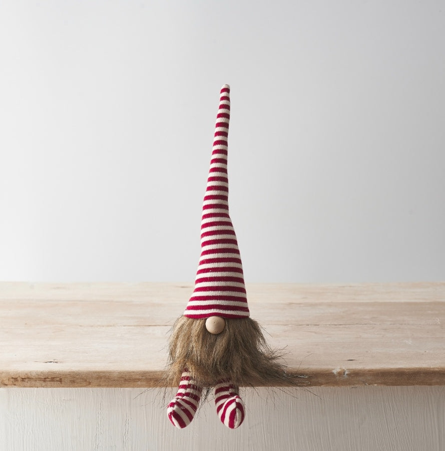 Une charmante décoration gonk avec un motif à rayures rouges et blanches accrocheur et une barbe moelleuse.