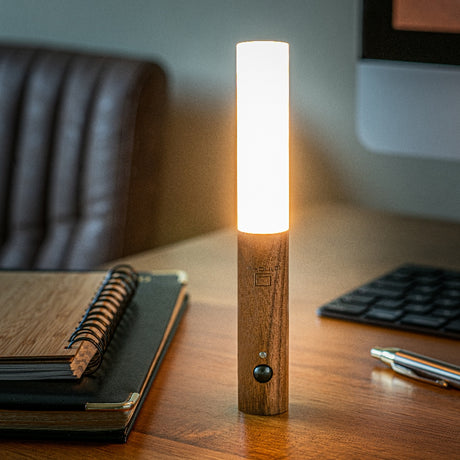 Le point central du design est une base octogonale magnifiquement formée avec finition en bois avec bouton de commande tactile et batterie rechargeable intégrée, ce qui en fait une lampe de bureau totalement sans fil et permet de la positionner sous trois angles différents.